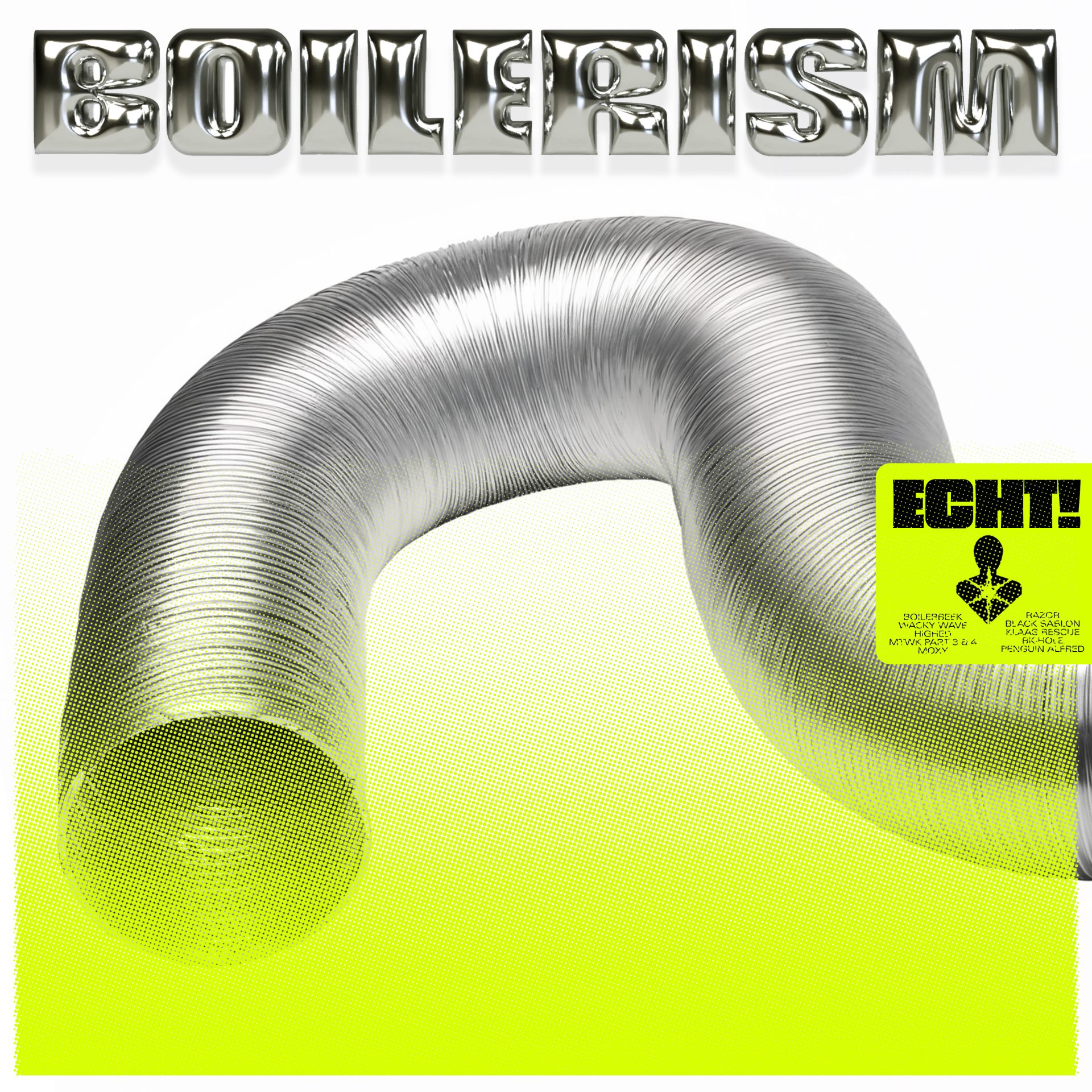 After their groundbreaking debut EP “Douf” (2019) and acclaimed albums “INWANE “(2021) and “Sink-Along” (2023), ECHT! is back with their most daring release yet: “Boilerism”. On this new record, they push beyond their signature bass-heavy sound, exploring faster tempos and embracing genres like acid, drum’n’bass, footwork, and UK garage. While the grooves hit harder and the rhythms get more mechanical, their flair for the unpredictable remains, with tracks that twist, turn, and surprise at every moment.