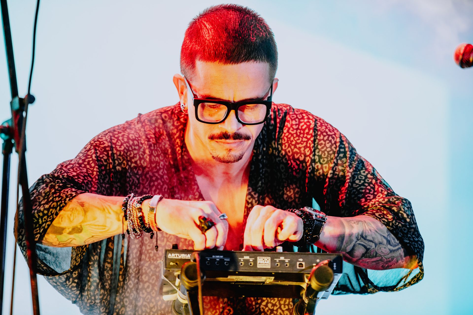 On stage, he creates an energetic and mystical performance blending Pan African rhythm with sounds from the Southern American indigenous tradition and global bass.