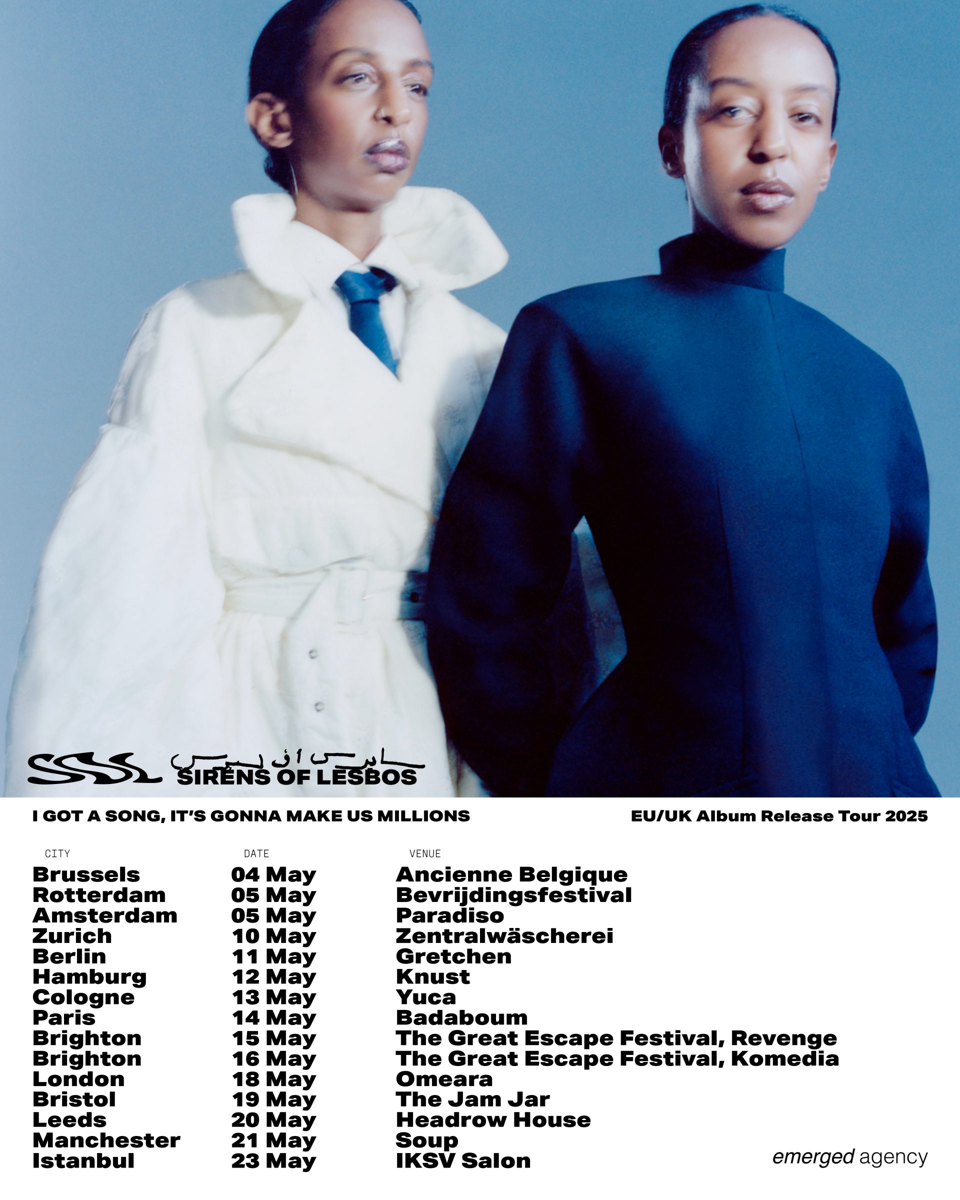 Jazz Café London, Paradiso Amsterdam, Fusion Festival—these were just some of the iconic moments in Sirens Of Lesbos’ sweeping 30-date tour in 2024. Now, after a pause to recharge and reflect, the Eritrean-Sudanese-Swiss duo is set to return with a powerful live performance, unveiling their much-anticipated new album “I Got A Song”, it’s gonna make us millions (April 2024).